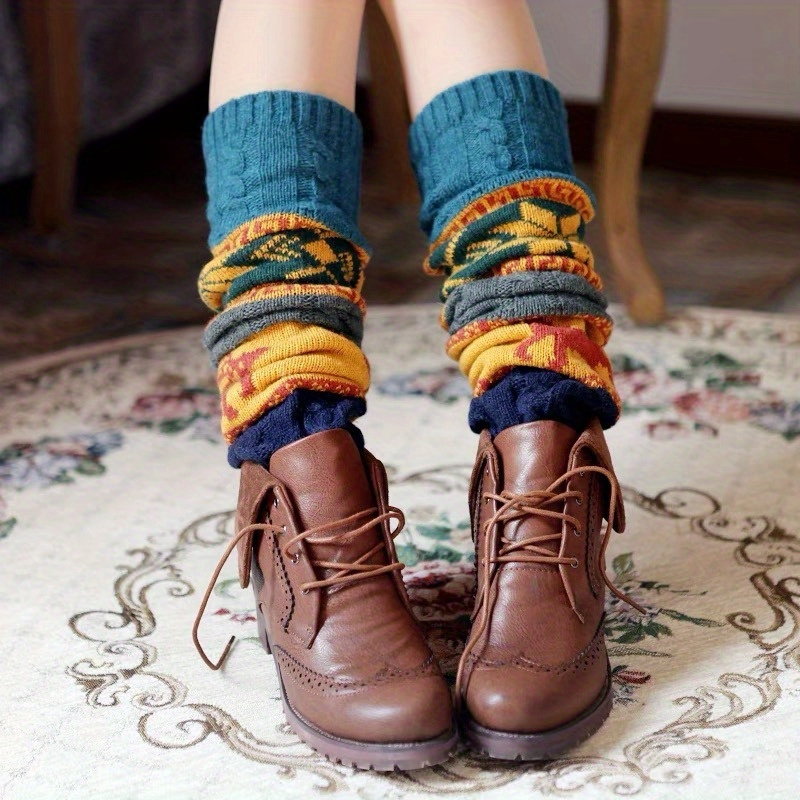 1 Pair Women's Christmas Deer & Snowflake Crochet Knee-High Socks - Stretchy Winter Boot Socks with Leg Warmers, Multi-Color Festive Patterns, Hand Wash Only, Christmas Socks