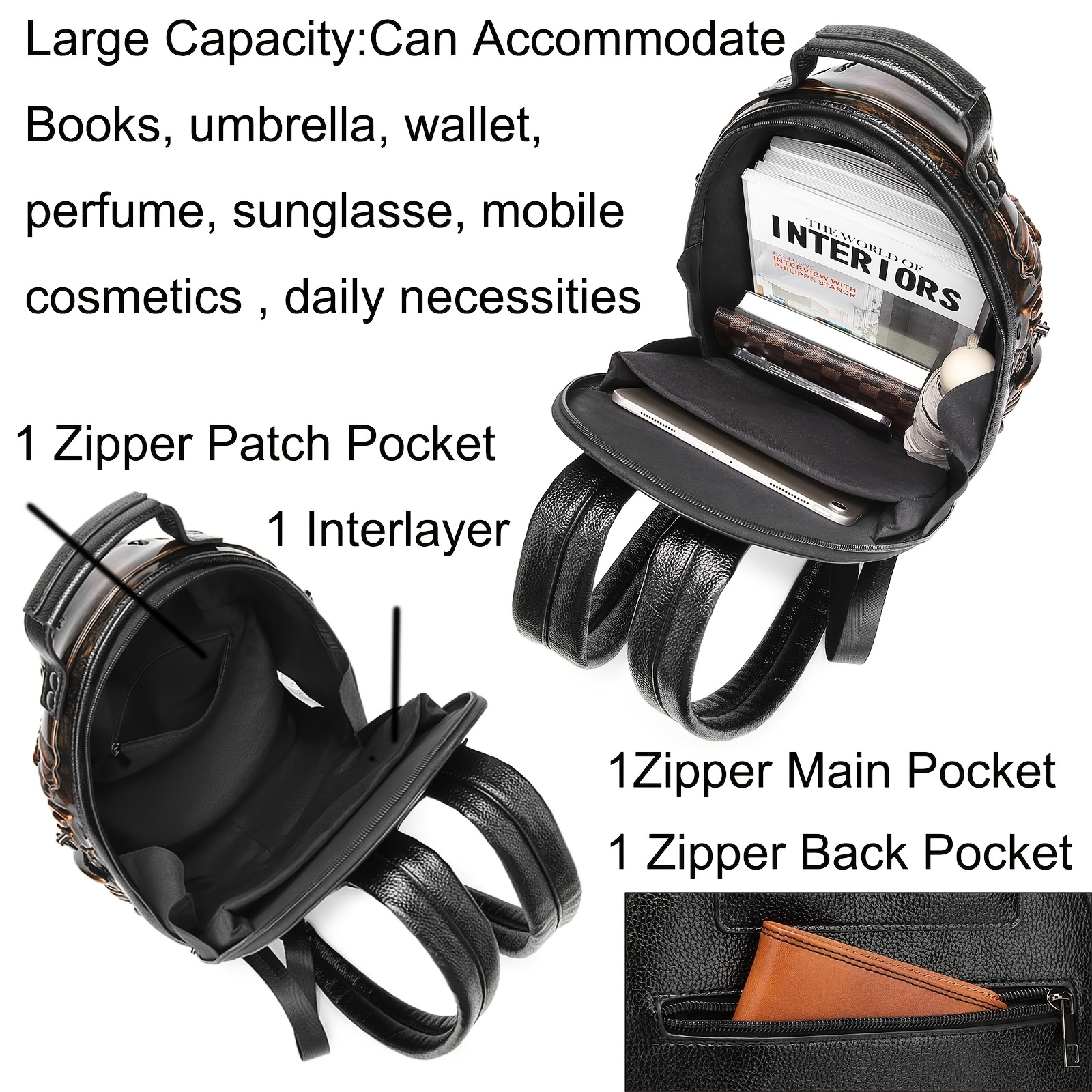 Unique 3D Alien Design Backpack - Street Punk Style, Unisex with Adjustable Straps, Zipper Closure, Black & Golden Accents, Perfect for Daily Commute, Ideal Gift for Sci-Fi and Punk Enthusiasts