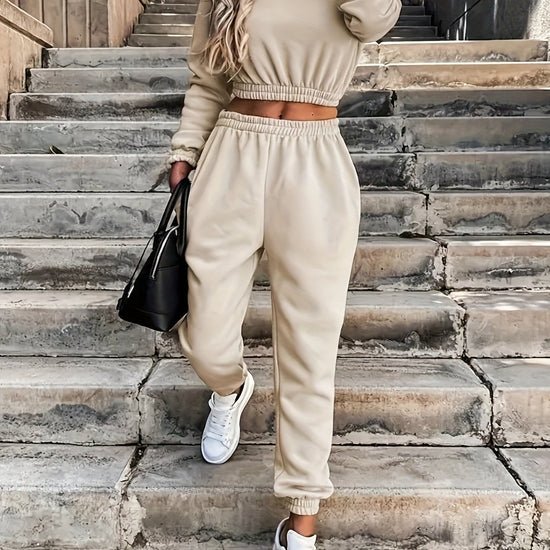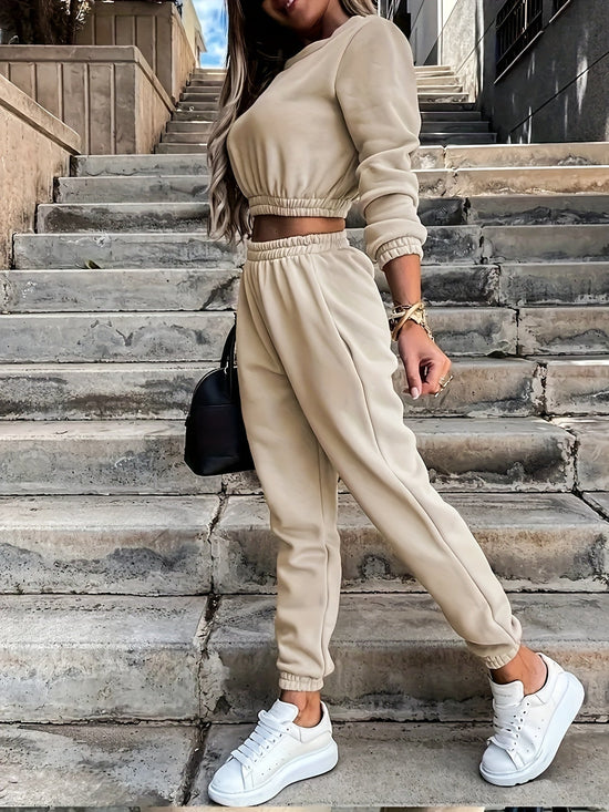 Women's New Round Neck Elastic Waist Top And Trousers Two-piece Set
