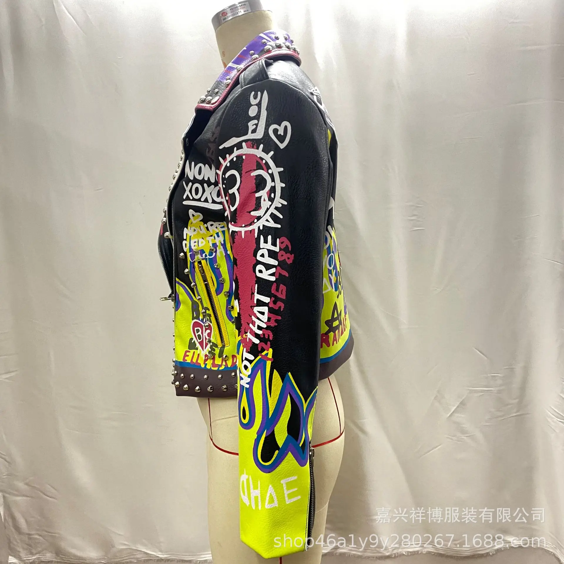 4XL fashion graffiti beading Women pu Leather Jacket Punk Style Motorcyle embrodiery leather Jackets Coats Streetwear F803