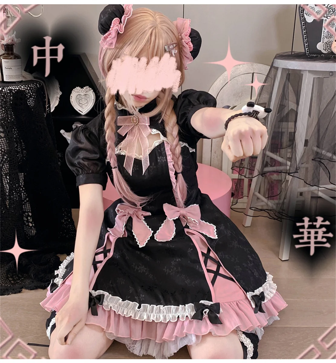 Stile cinese dolce ragazza Lolita Op Cheongsam adorabile pizzo fiocco stampa ciliegio fiore perla bottone manica a palloncino vestito arricciato