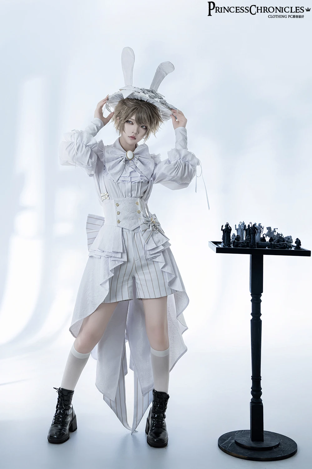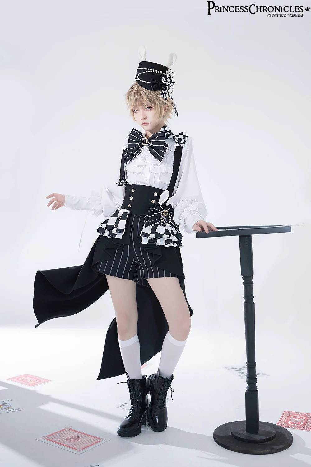 Questo set completo comprende una maglietta, una cintura, un cinturino, un cappello con orecchie da coniglio, pantaloncini e una spilla staccabile, creando un'esperienza completa che incarna il fascino maschile Lolita.
