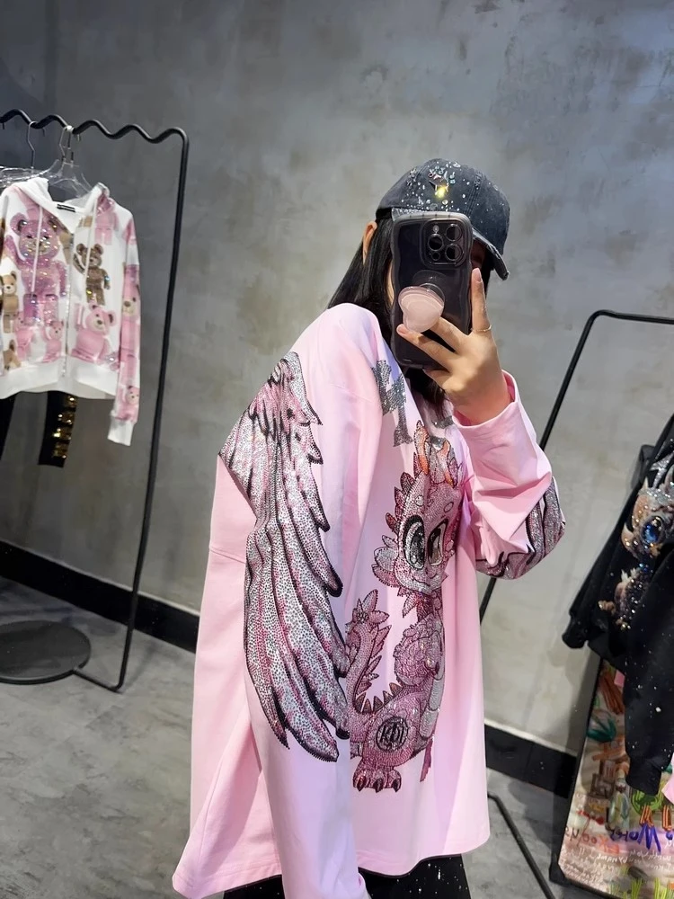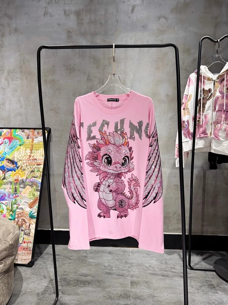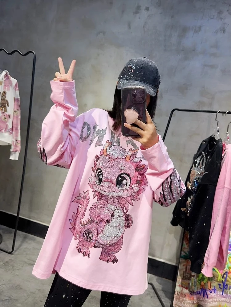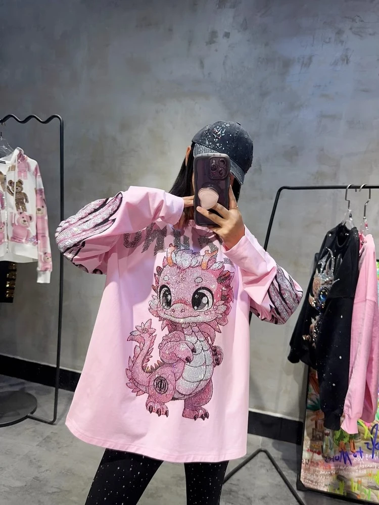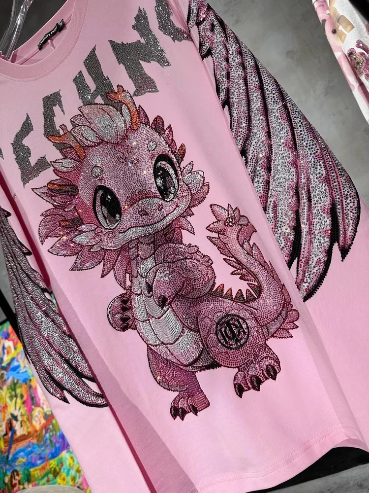 Cartoon Hot Diamonds Dinosaurs Plus Size Tops Y2K Streetwear Sweet Cute Fashion Large Size Tops Spring New High Street T-shirts