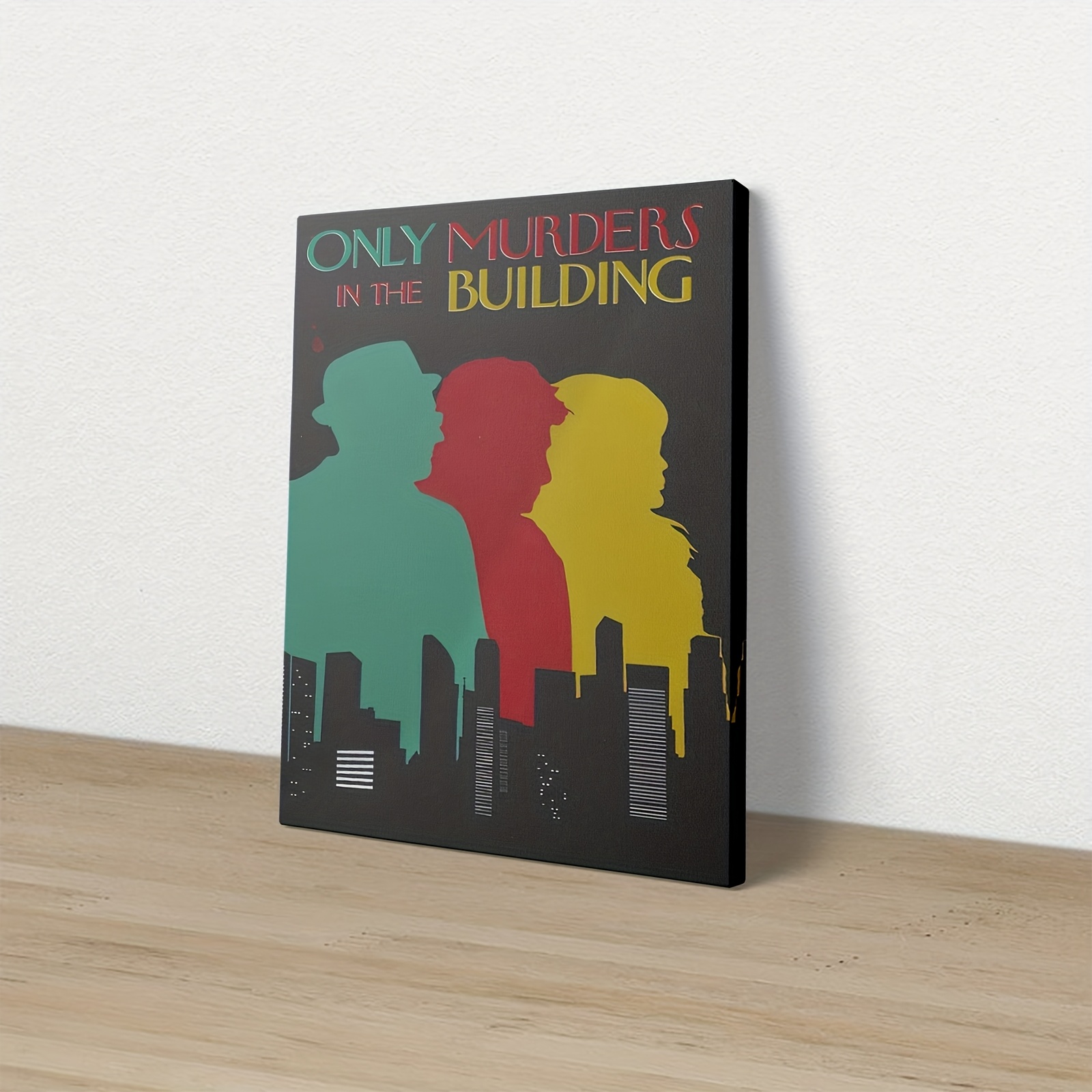 1pc Framed Canvas Painting - Only Murders in the Building Inspired Mystery Drama Decor - Dark Background with Green, Red, Yellow - Ready-to-Hang for Living Room, Office, Cafe - True Crime Fan Gift Idea - Framed Flat Canvas Wa