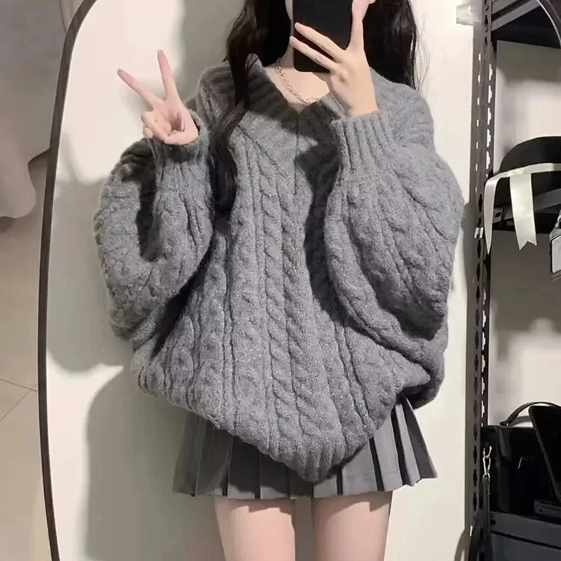 Autumn Winter Women Sweater Harajuku Oversized Knitted Pullovers Korean Long Sleeve V Neck Knitwear Preppy Solid Loose Jumper