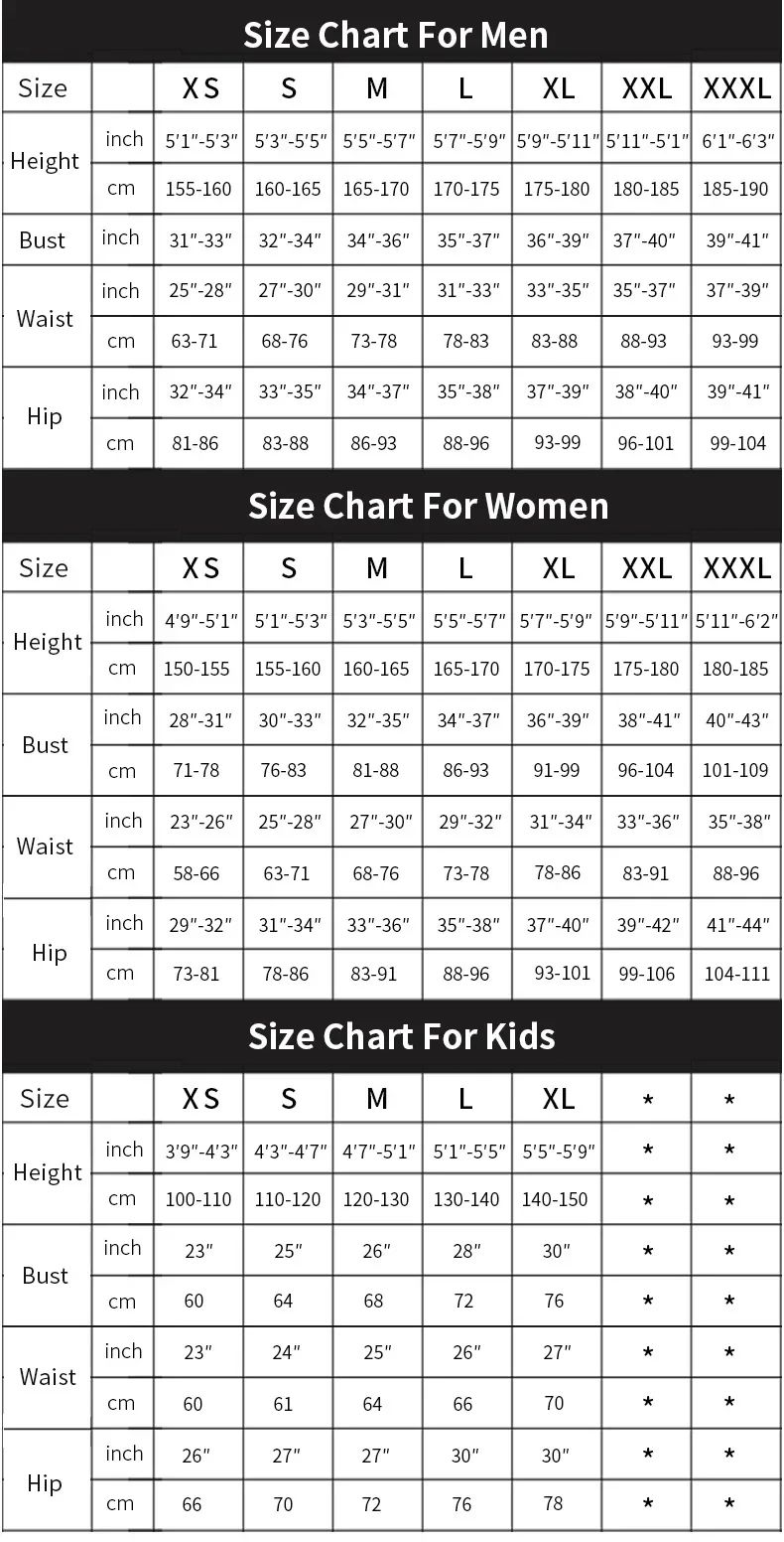 3.Size: Child (S/M/L/XL),Adults (S/M/L/XL/XXL/XXXL)