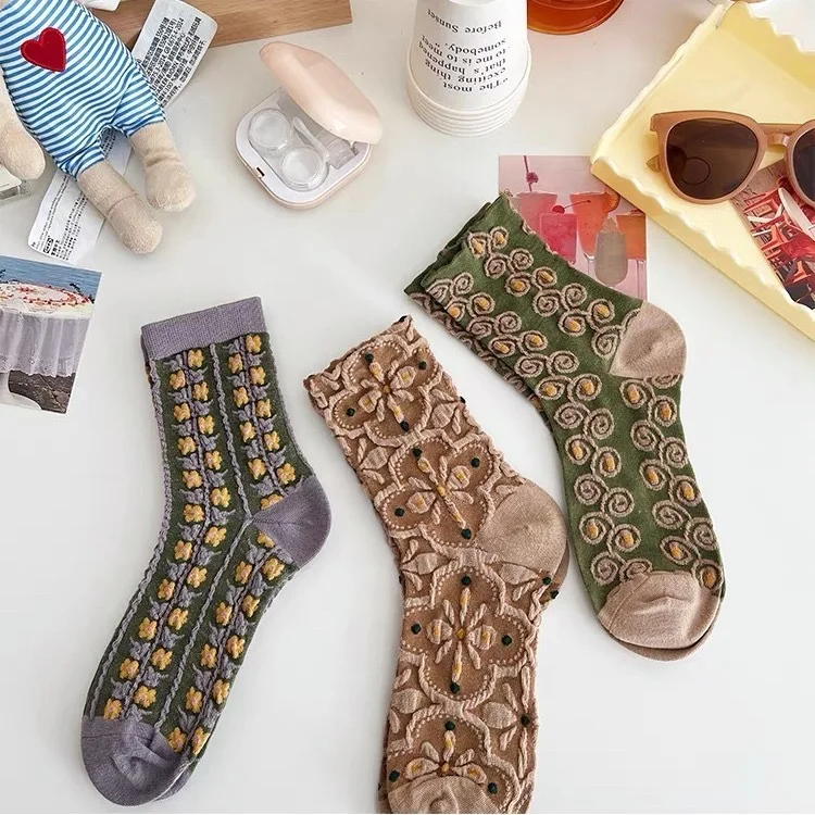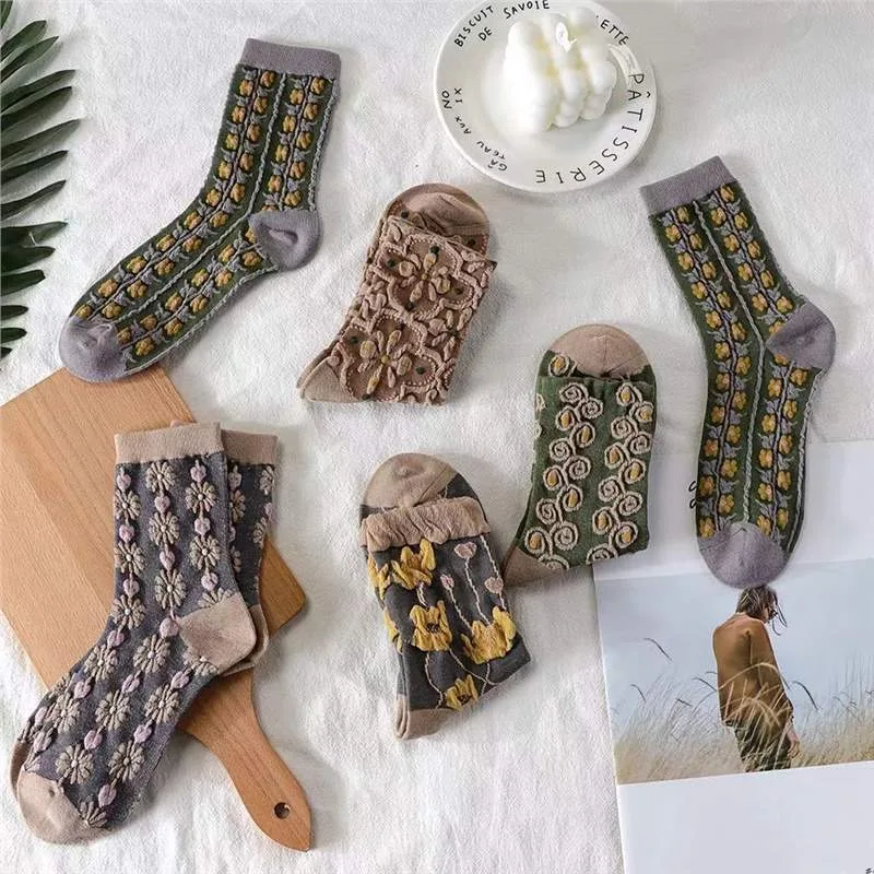 Cotton Fashion Korea Harajuku Retro Floral Vintage Woman Socks Novelty Ethnic Elegant Casual Ladies Girls Dress Brown Sox Autumn