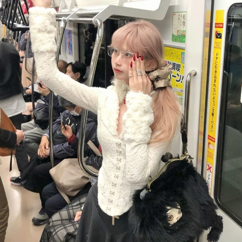 Deeptown Y2k Black Vintage Lace Gothic Women Shirt Harajuku V Neck Hollow Out Long Sleeve Japanese Fashion Blouses Slim Gyaru