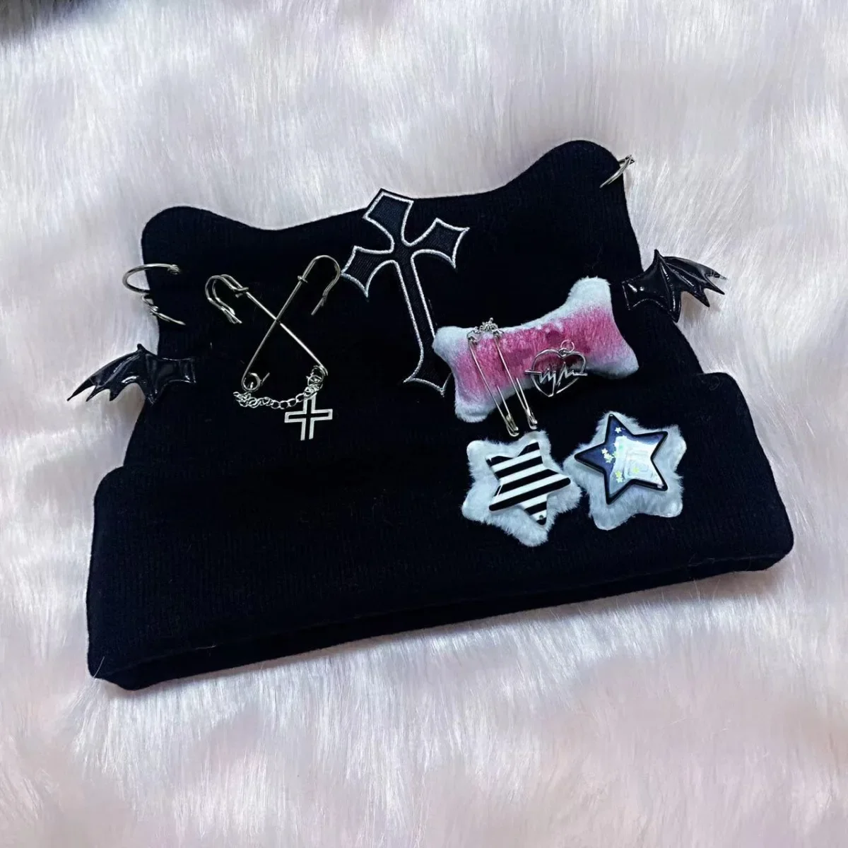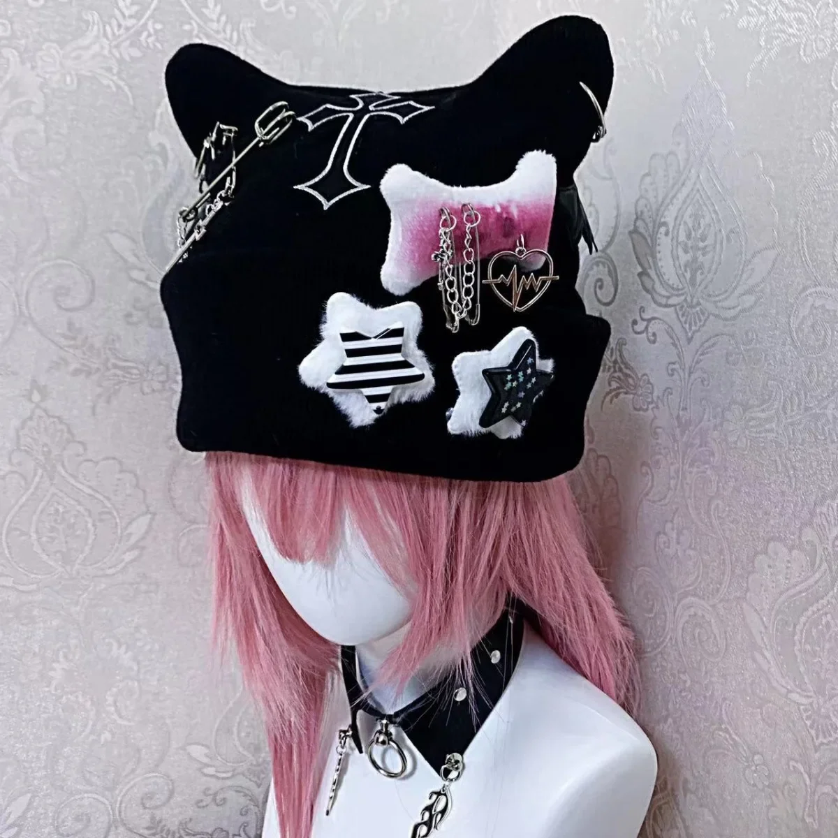 • Gothic Punk Design : Featuring a cross skull motif and cat ears, this hat combines edgy gothic punk aesthetics with a cute touch.