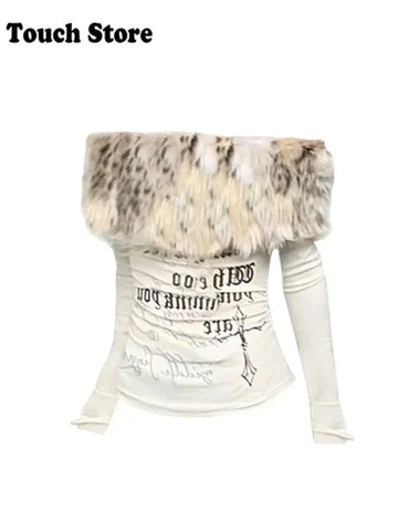 Gyaru Korean Fashion Clothing Autumn and Winter Women's Shoujo Y2k Coquette T-Shirt Slant Neck T-Shirt Long Sleeve Cropped Top