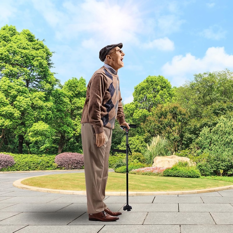 lip if you are on wet pavement or in all terrain, giving you the flexibility to walk, run and turn easily. Safely supporting up to 250 pounds, this sturdy cane will support you throughout your daily life. Perfect Item: Height adjustable, foldable, portable, with LED Light, soft foam grip handle, slip-resistant rotatable pivoting quad base. The great classic Cane make you easily walk any type of terrain indoor outdoor like park, in the rain, or snow, comfortable and safety.