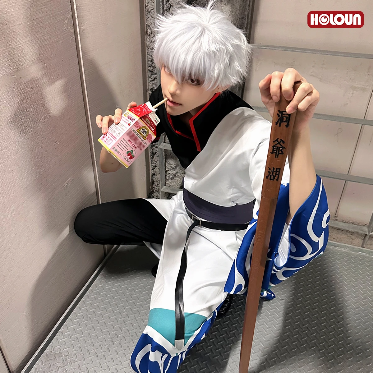 HOLOUN Gintama Anime Sakata Gintoki Cosplay Costume Wig Kimono Top Pants Cos Convention Halloween Christmas Gift SS69