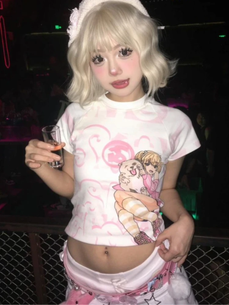 Japanese Camisetas Y2k Tshirts Crop Tops Women Clothing Short Sleeve O-neck Cute Tees Anime Print Casual Fashion Summer T-shirt