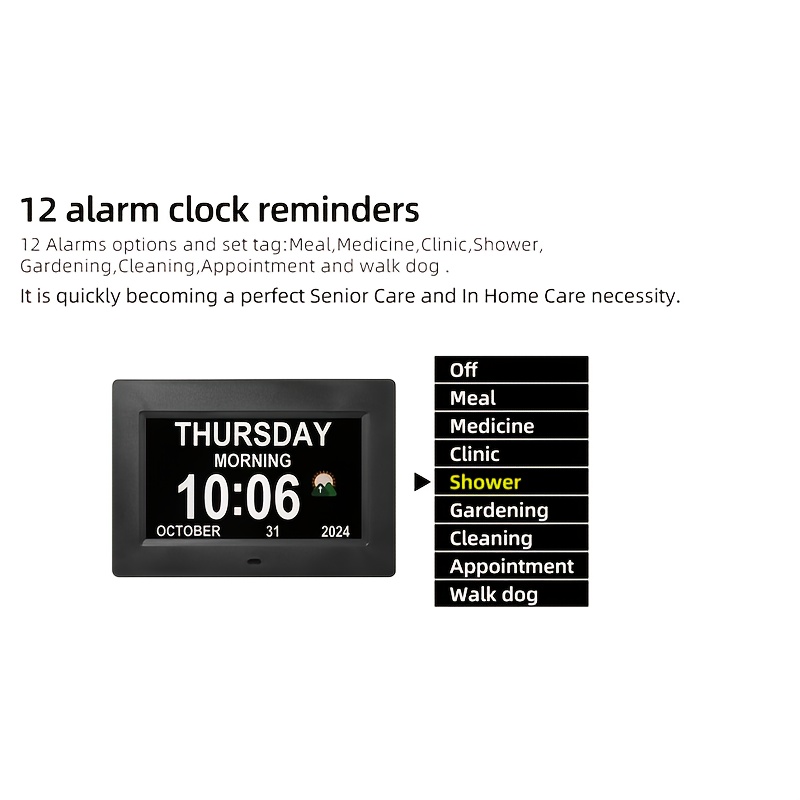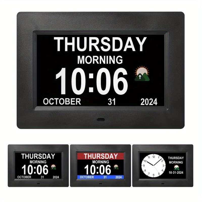 Large Digital Clock Designed for Seniors with Dementia, Featuring a Calendar Display, Alarms, And Functions As a Wall Clock Showing Day And Date. It Also Serves As an Alarm Clock, Desk Clock, Electronic Photo Frame, And Suppo