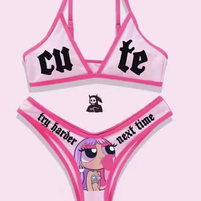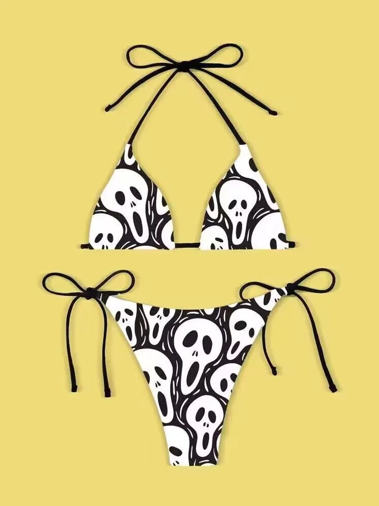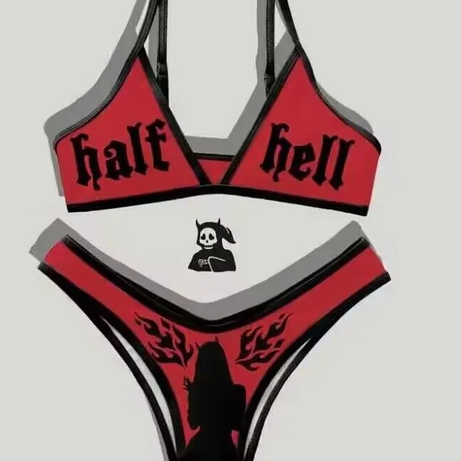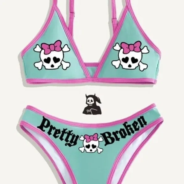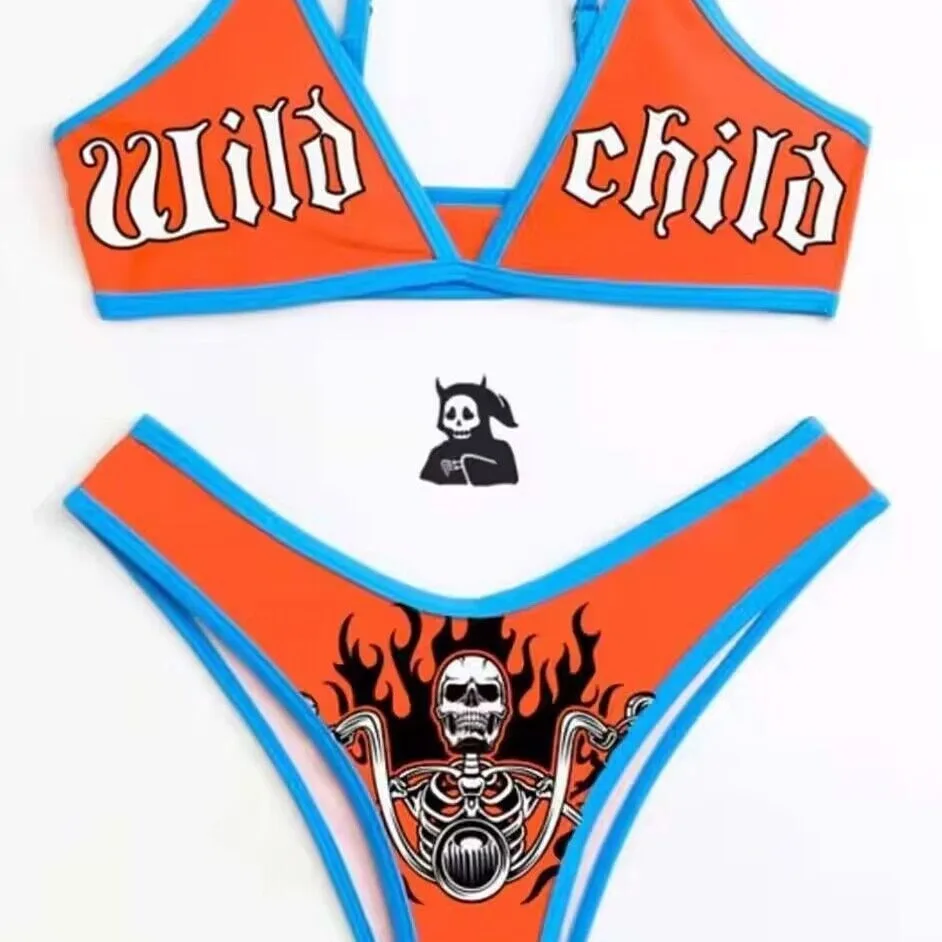 New Punk Gothic Letters Print Bikinis Set Sexy Bikini Women Skull Pattern V-neck Swimwear Fashion Swimsuit Bathing Suit