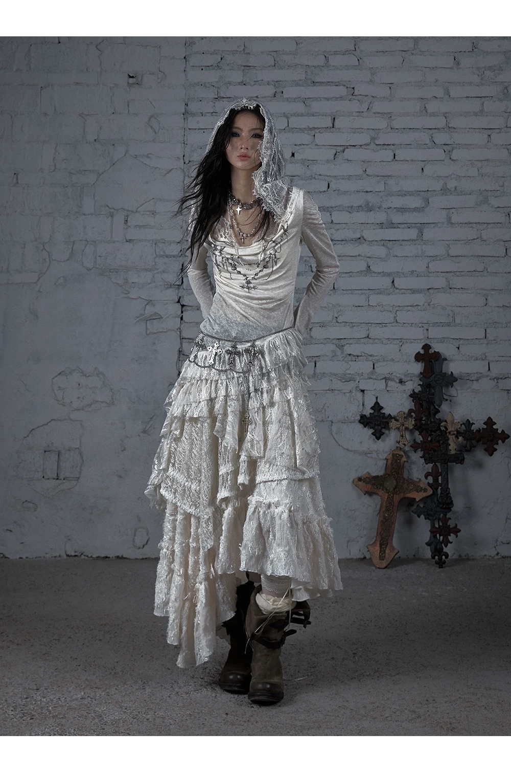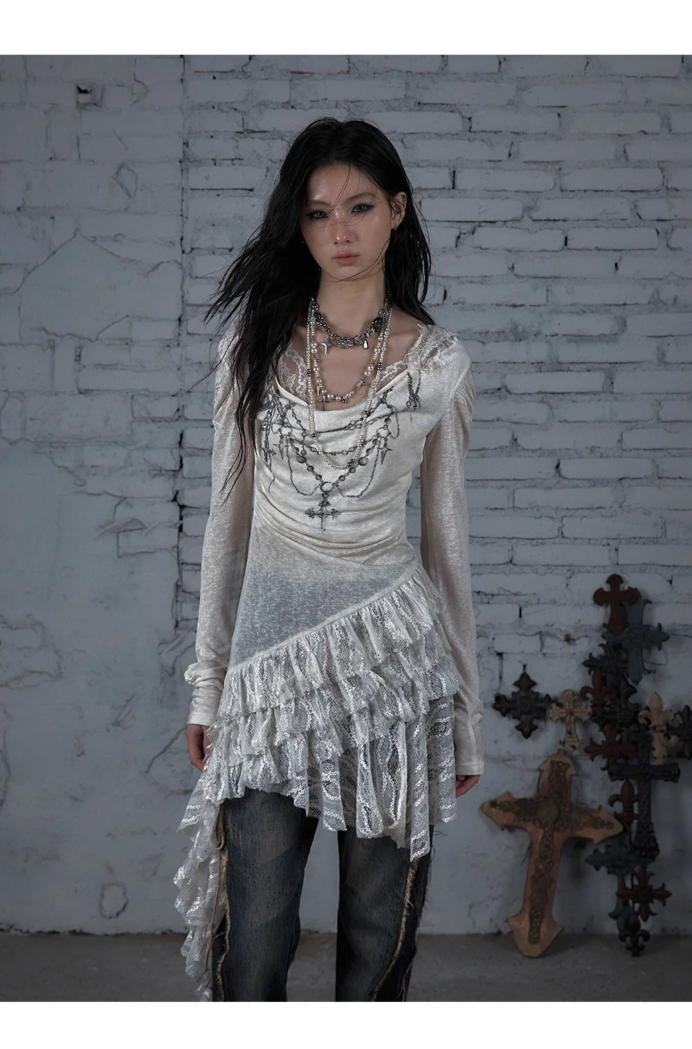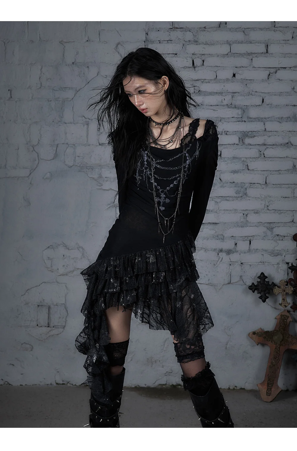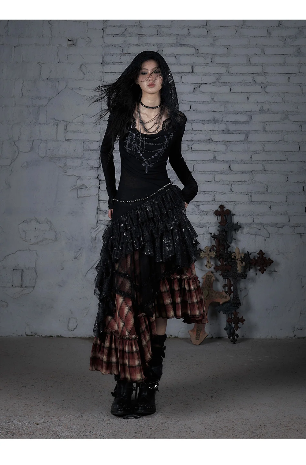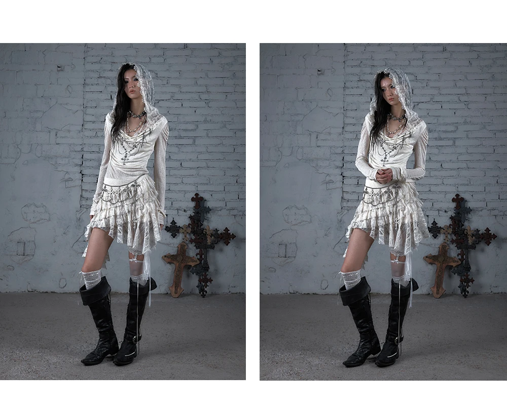 NO ROMANCE Fairy Sexy Punk Printing Half Transparent Lace Patch Knitted Long Sleeve Hooded Dresses Rock Gothic Design Vestidos