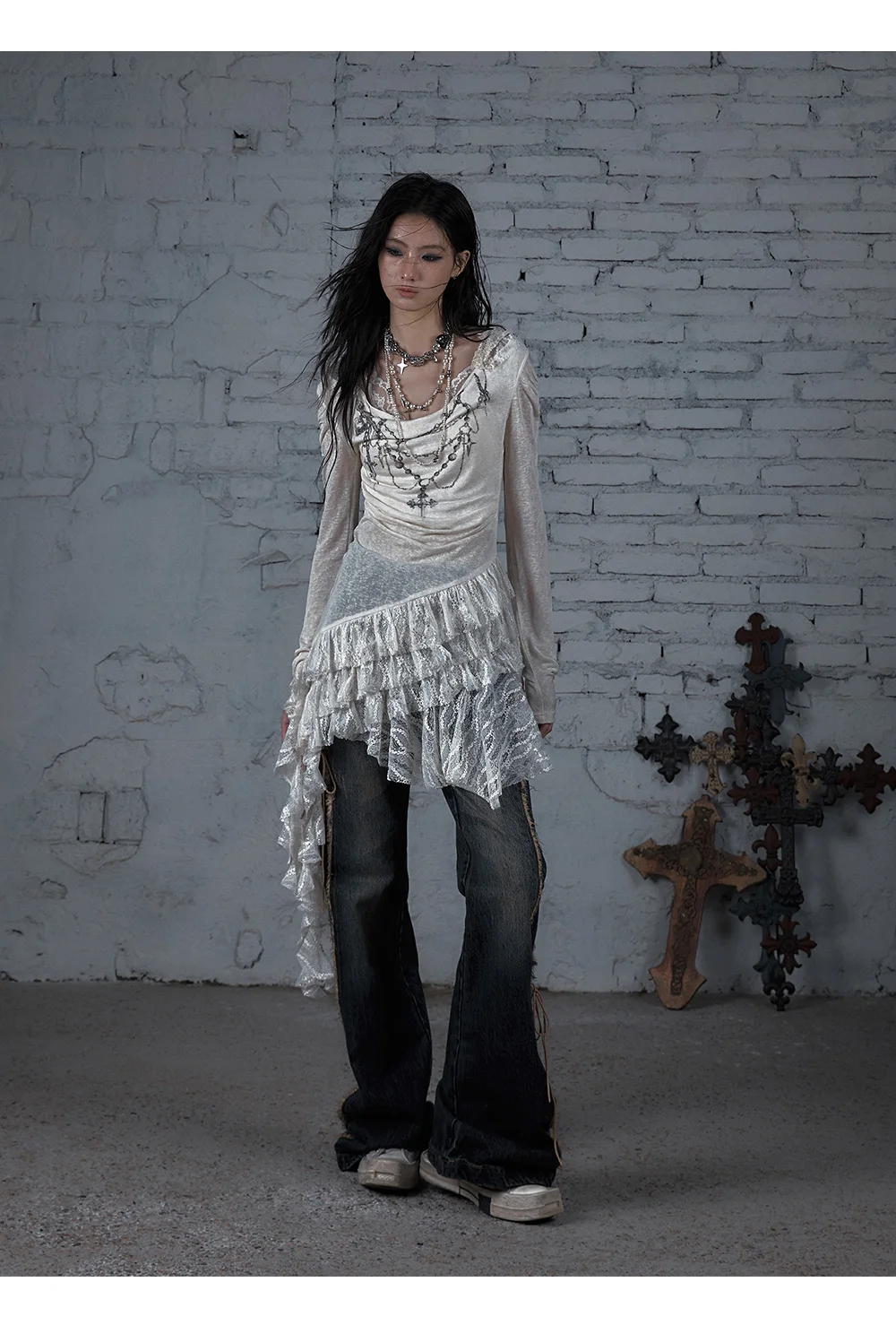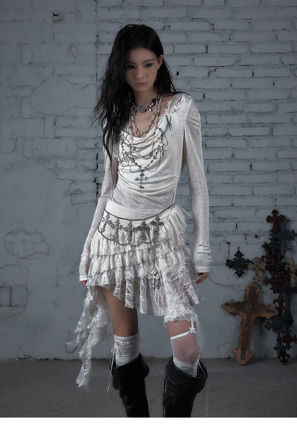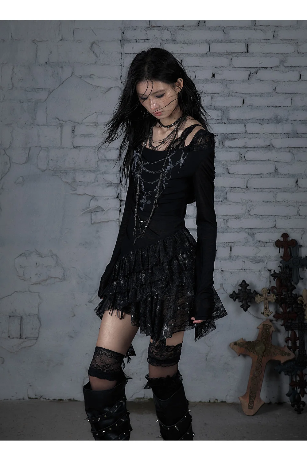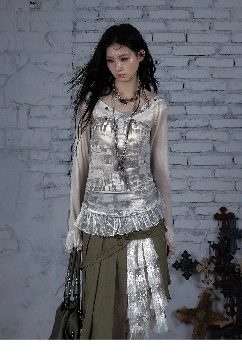 NO ROMANCE Fairy Sexy Punk Printing Half Transparent Lace Patch Knitted Long Sleeve Hooded Dresses Rock Gothic Design Vestidos