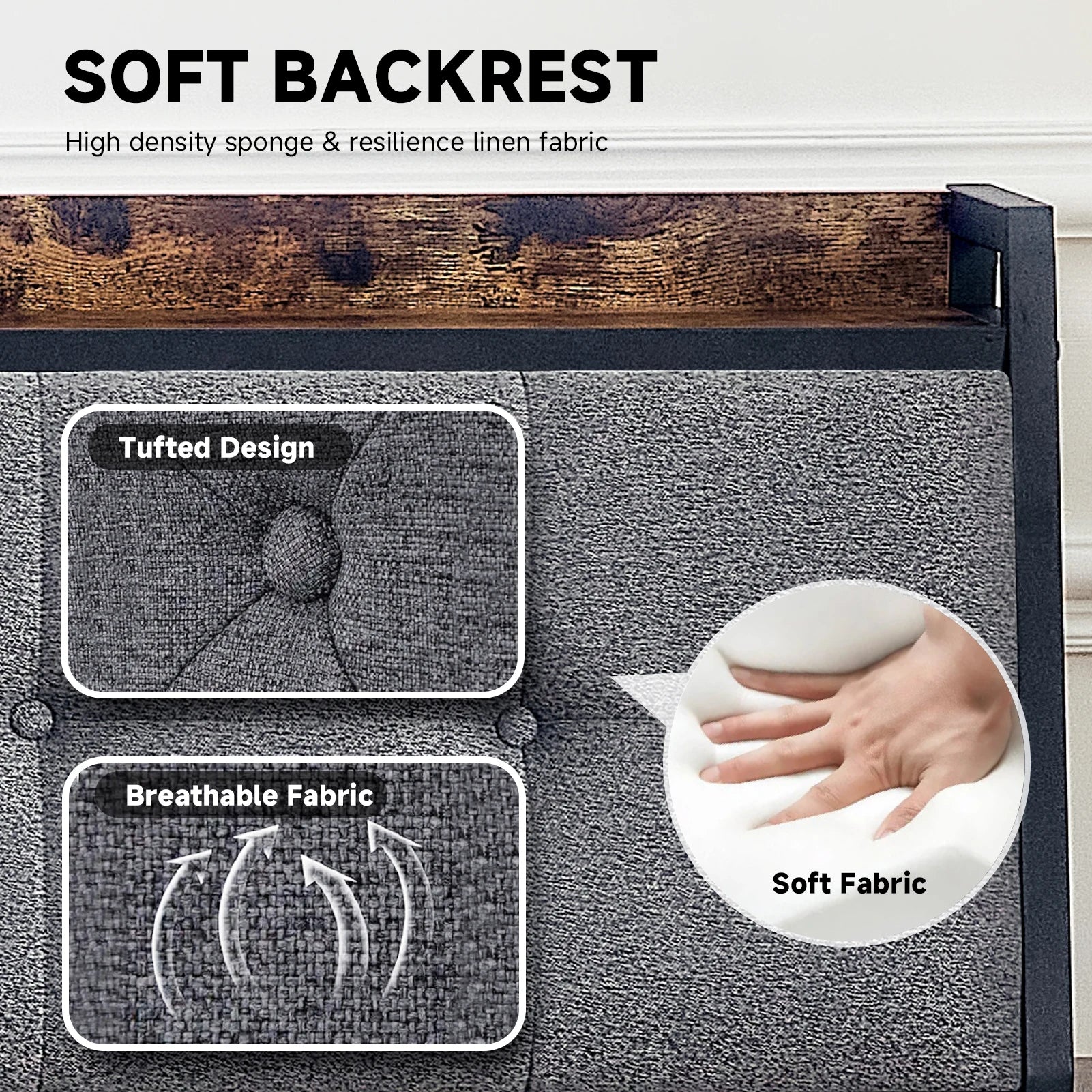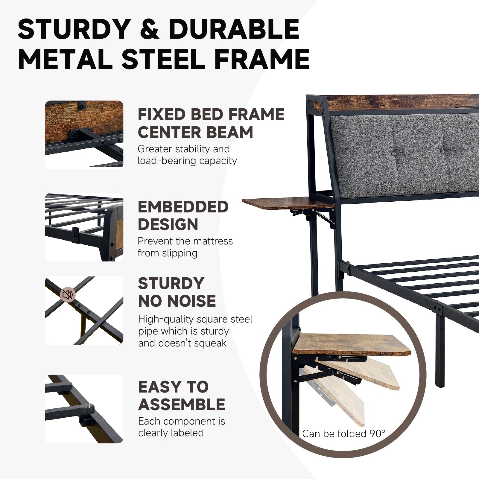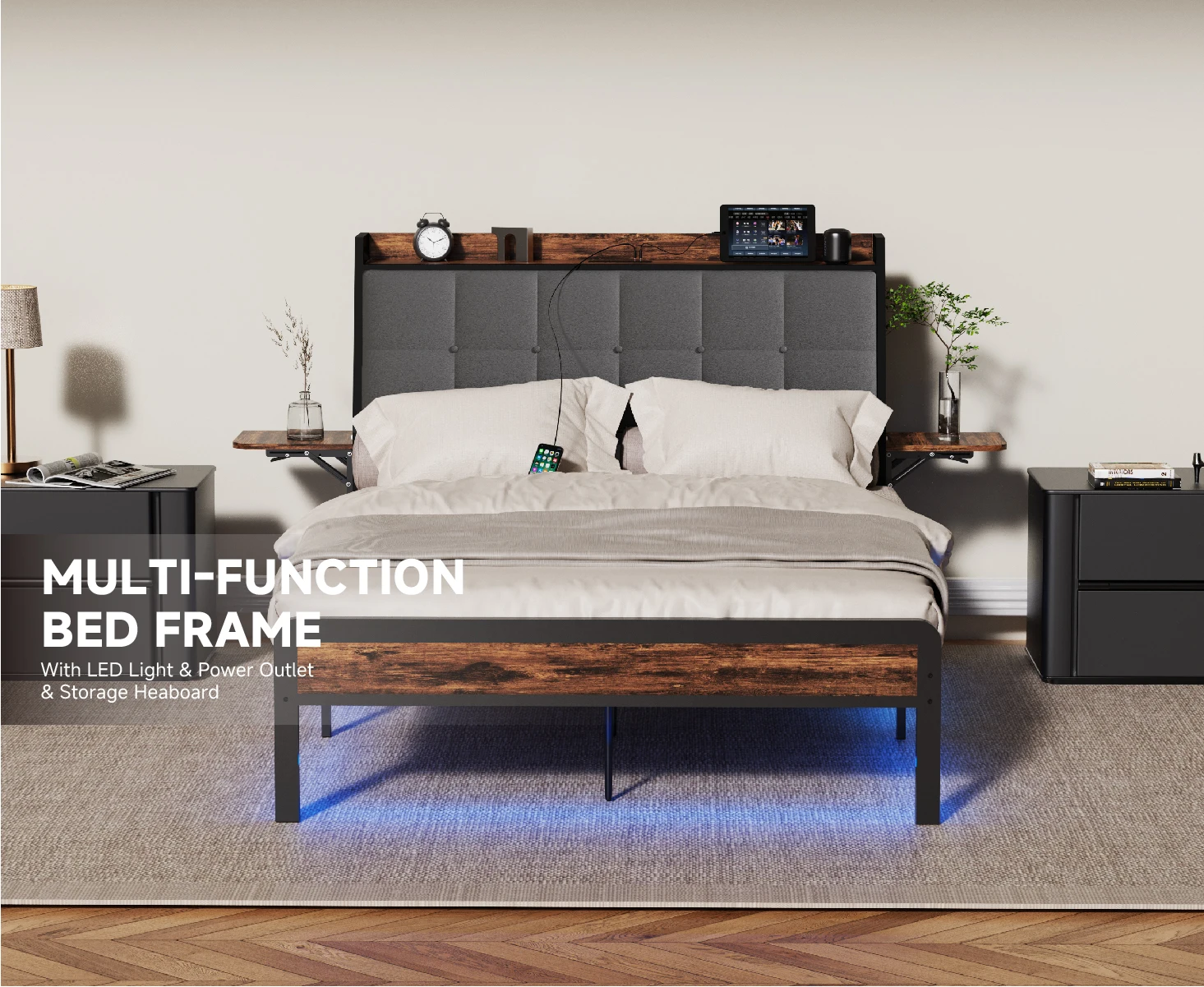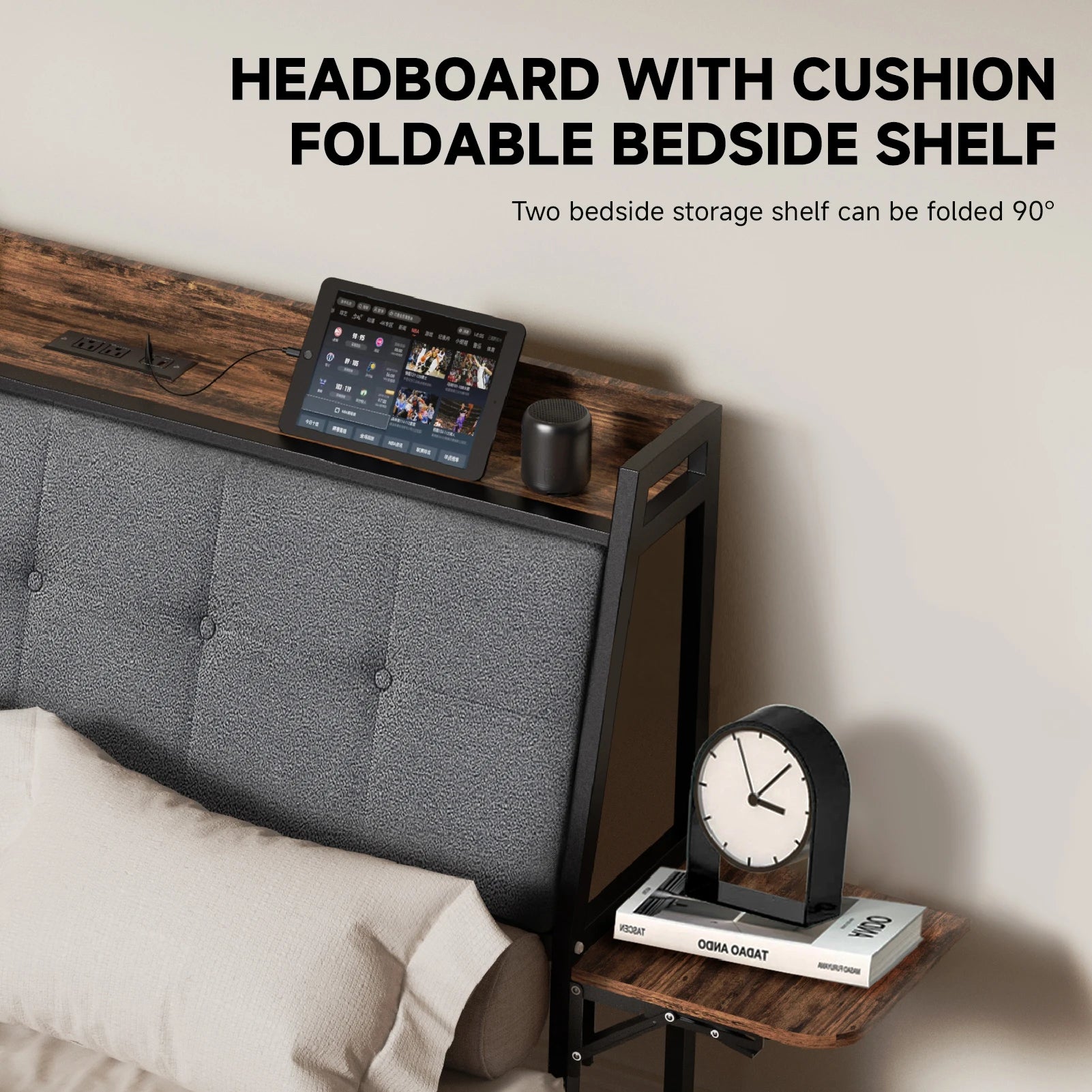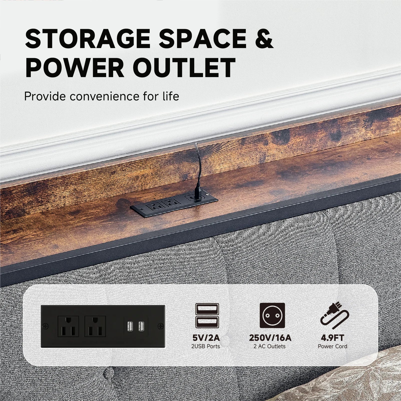 STORAGE HEADBOARD WITH CHARGING STATION: The headboard is equipped with a built-in charging station, including 2 AC Outlets, a USB port and a type-C port, allowing you to charge various electronic devices within easy reach. 2-Tier Storage shelf on the headboard can provide more storage space, making it convenient for you to place commonly used items such as magazines, phones, alarm clocks, etc