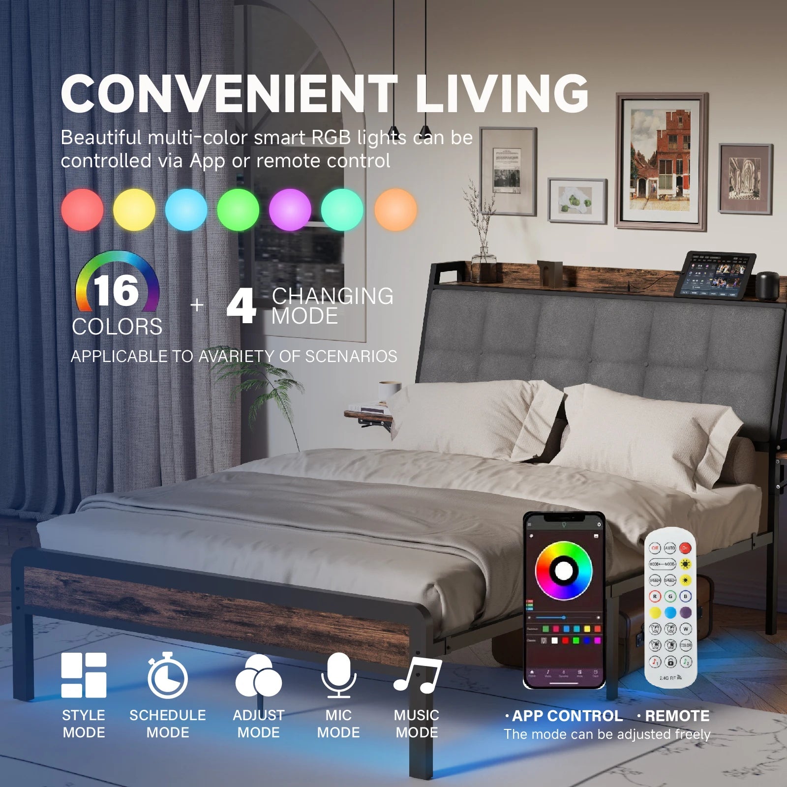 OPTIONAL SELF-ADHENSIVE LED LIGHTS— The bed frame comes with 1 extra self-adhesive led light, recommended assemble it on the bed frame headboard shelf or headboard backside. The remote / APP controllable RGB led lights, which are over 20 colors choosable and 4 adjustable modes, create your favorite bedroom atmosphere