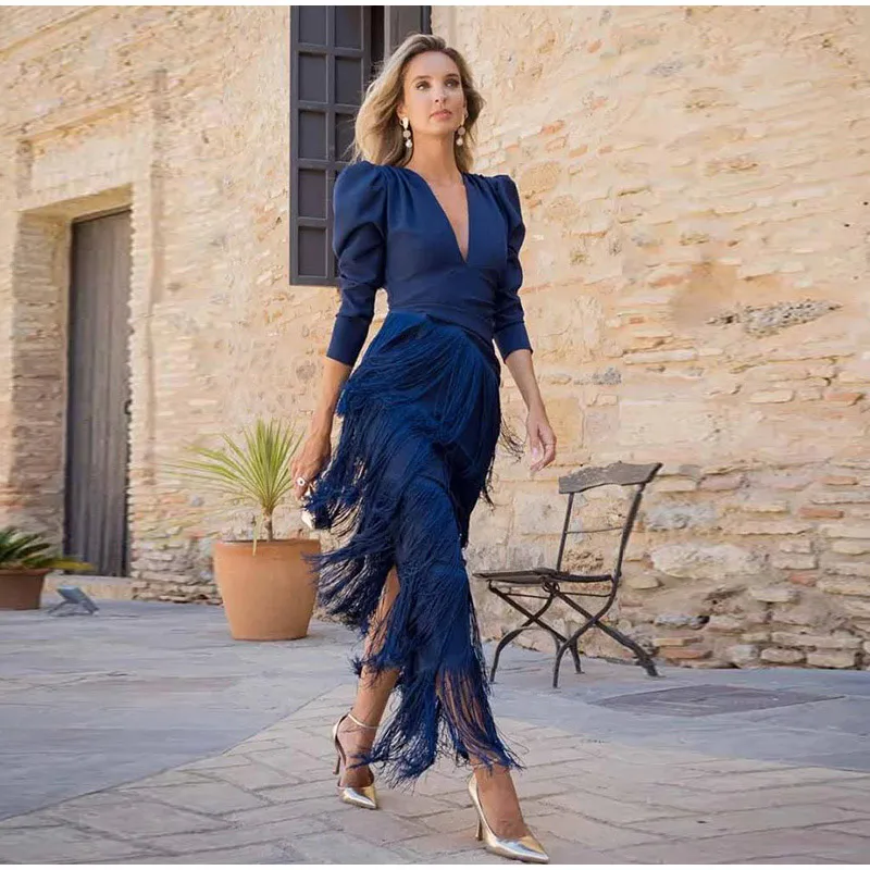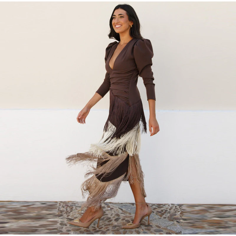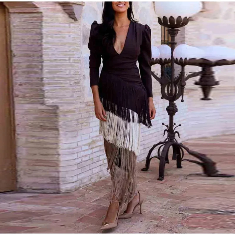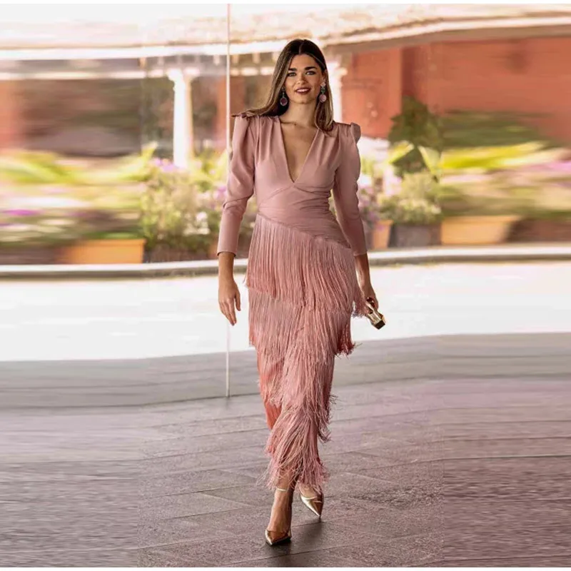Women Stacked Tassel Maxi Dress Elegant Deep V Neck Full Sleeve Slim Fit Long Gowns Lady New Evening Party Fashion Robes 2025