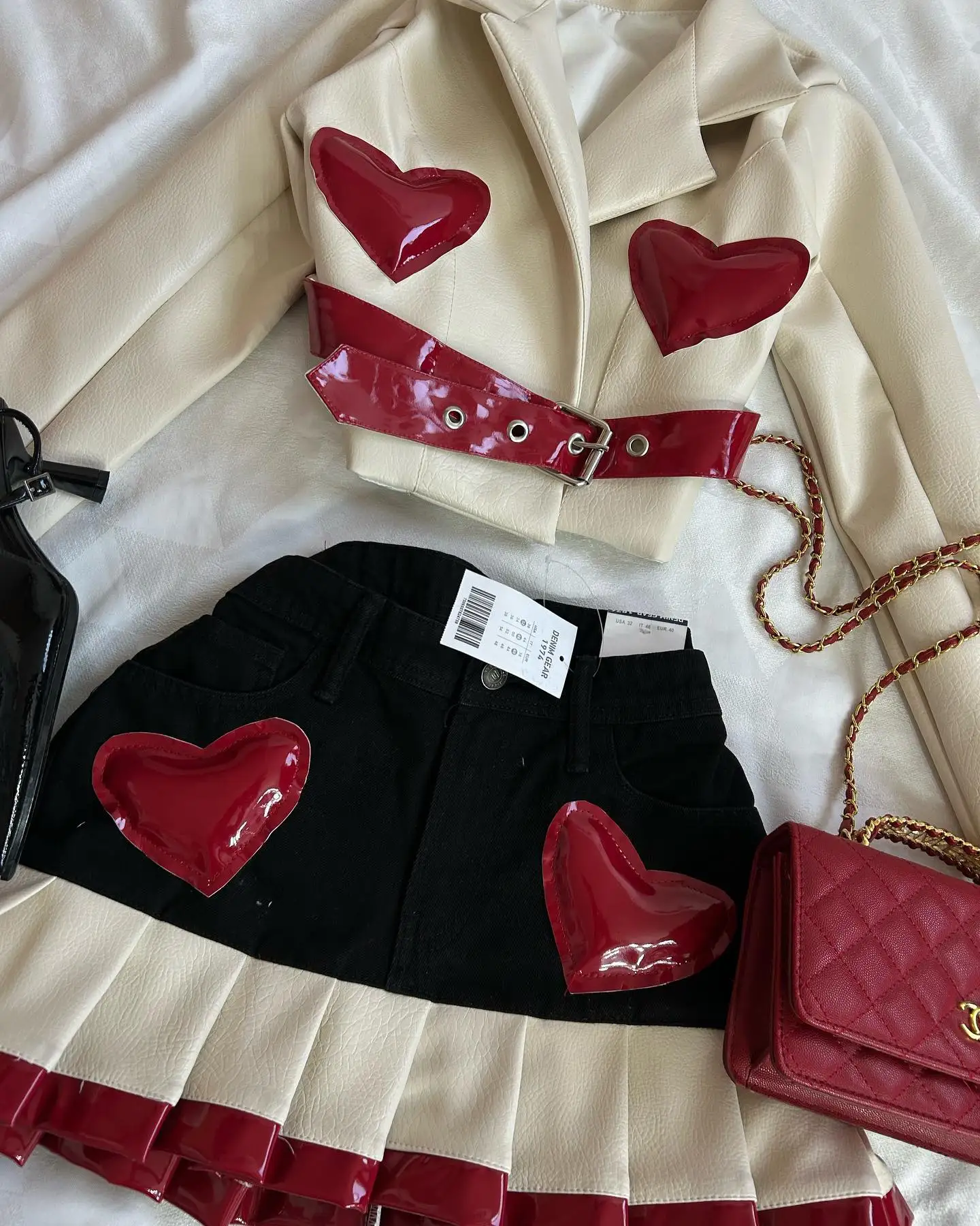 Y2K Womens Street Clothing Heart shaped Leather Clothing Two Punk Jacket Cut Denim Patchwork Retro Pleated Mini Skirt Jacket Set