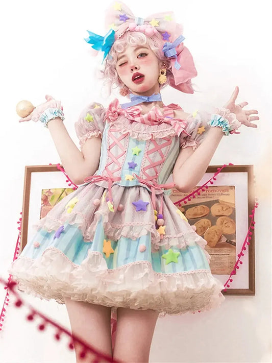 Japanese Style Lolita OP Sweet Girls Cosplay Kawaii Lolita Cute Striped Mesh Candy Star Fur Ball Ribbon Bow Ruffle Dress