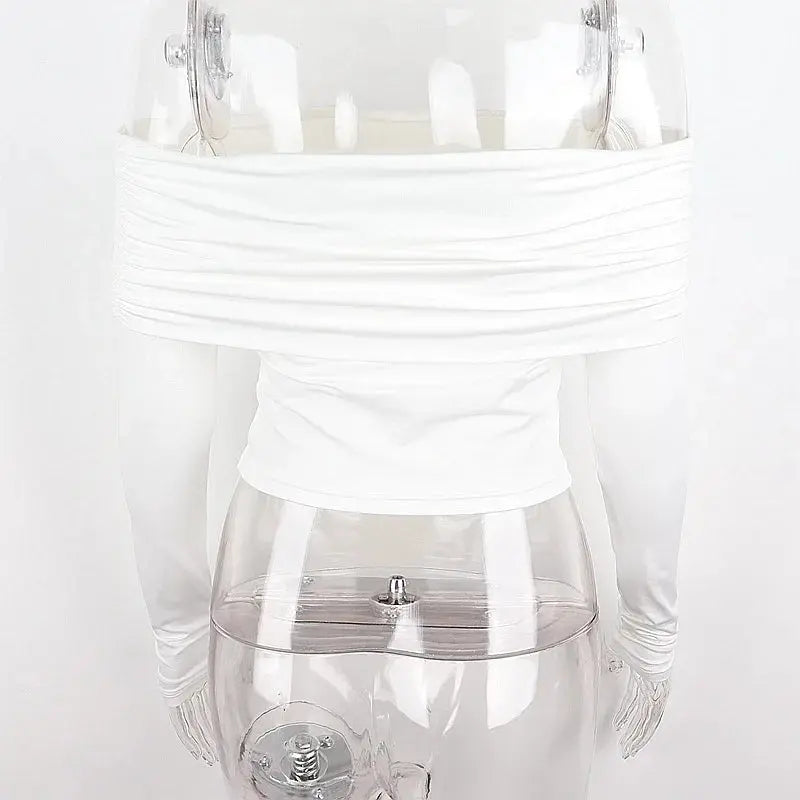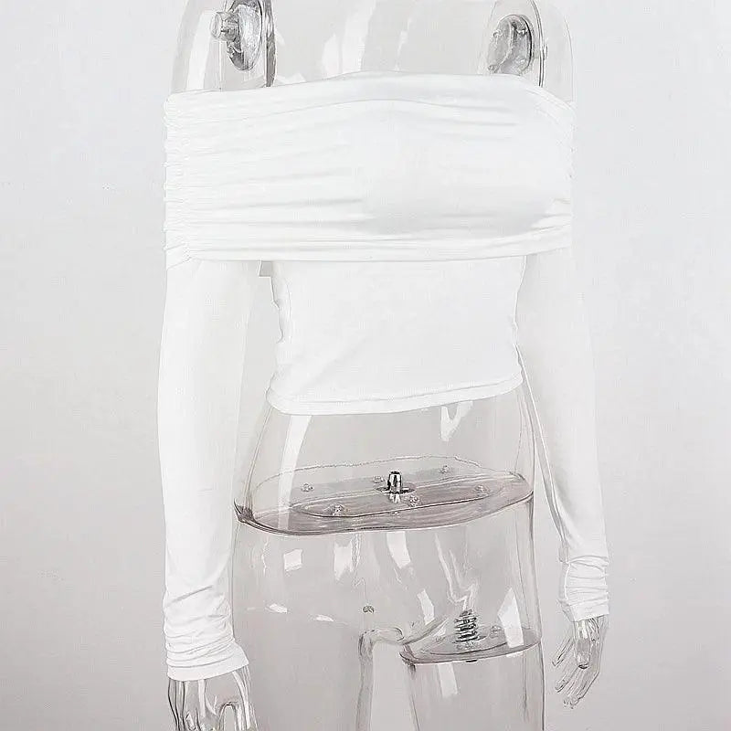 Women Off Shoulder Long Sleeve Slim Tops and Blouses Mesh Ruched Crop Tops Summer Autumn Y2K Sexy Elegant Shirts Female SS69