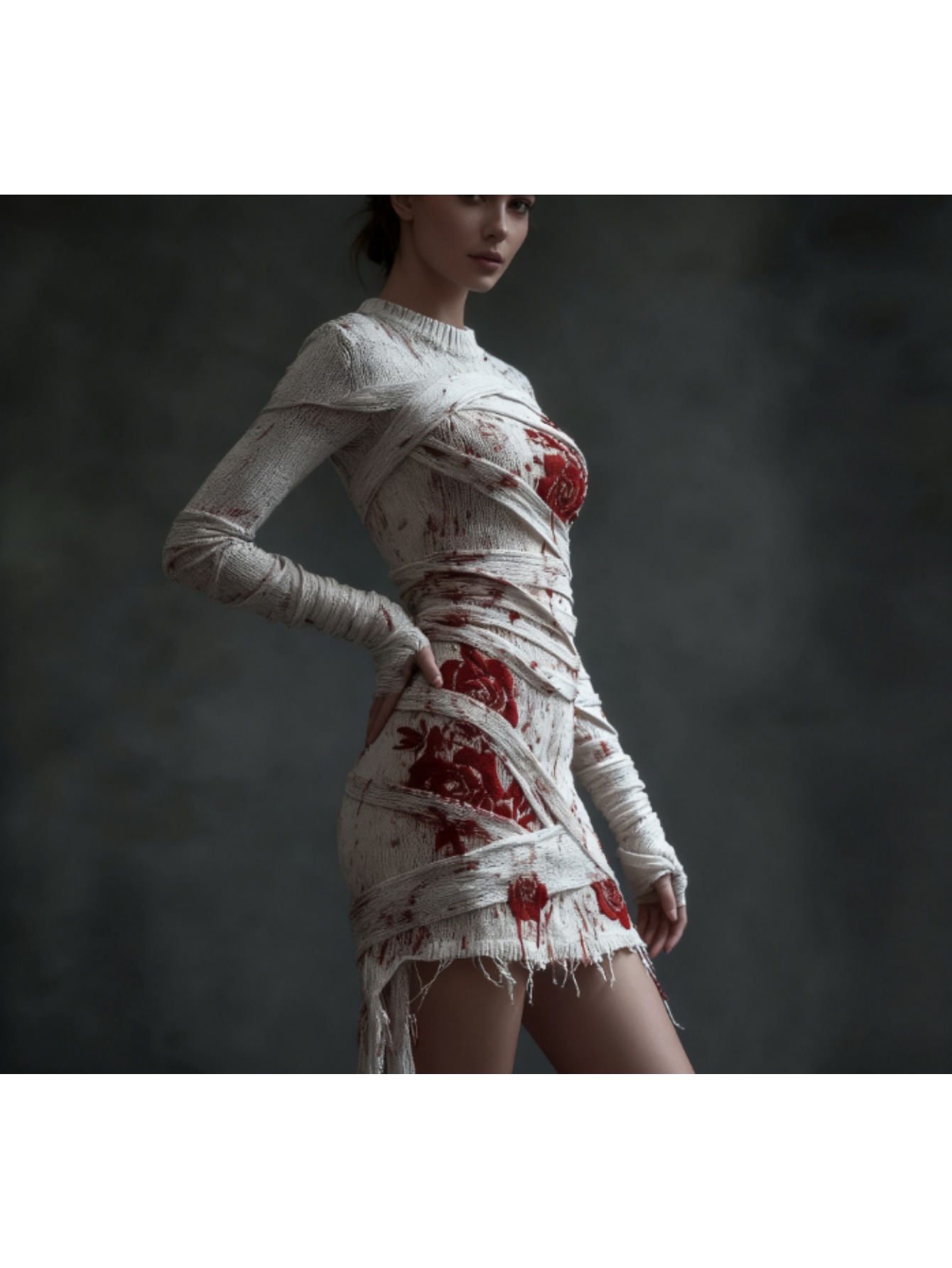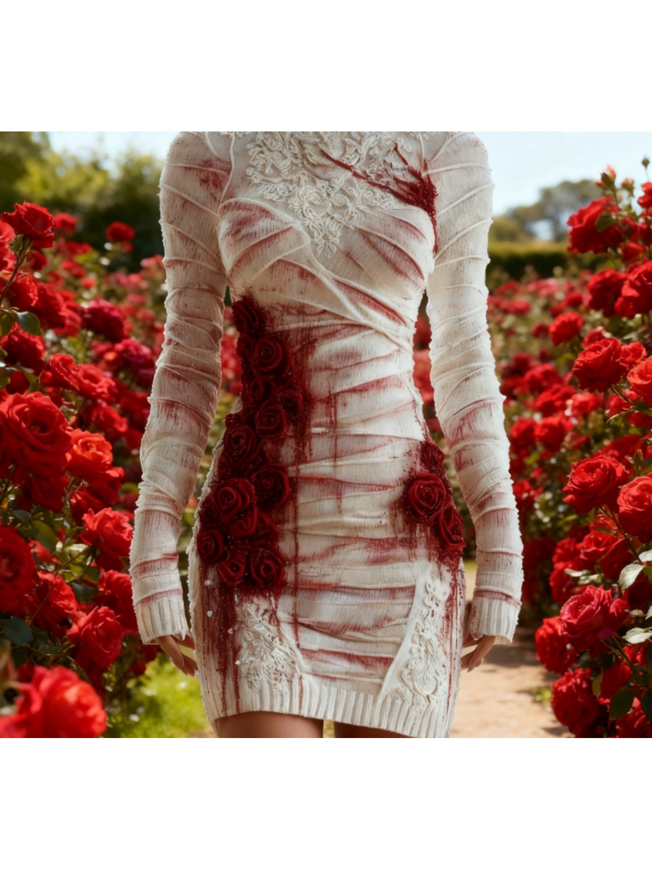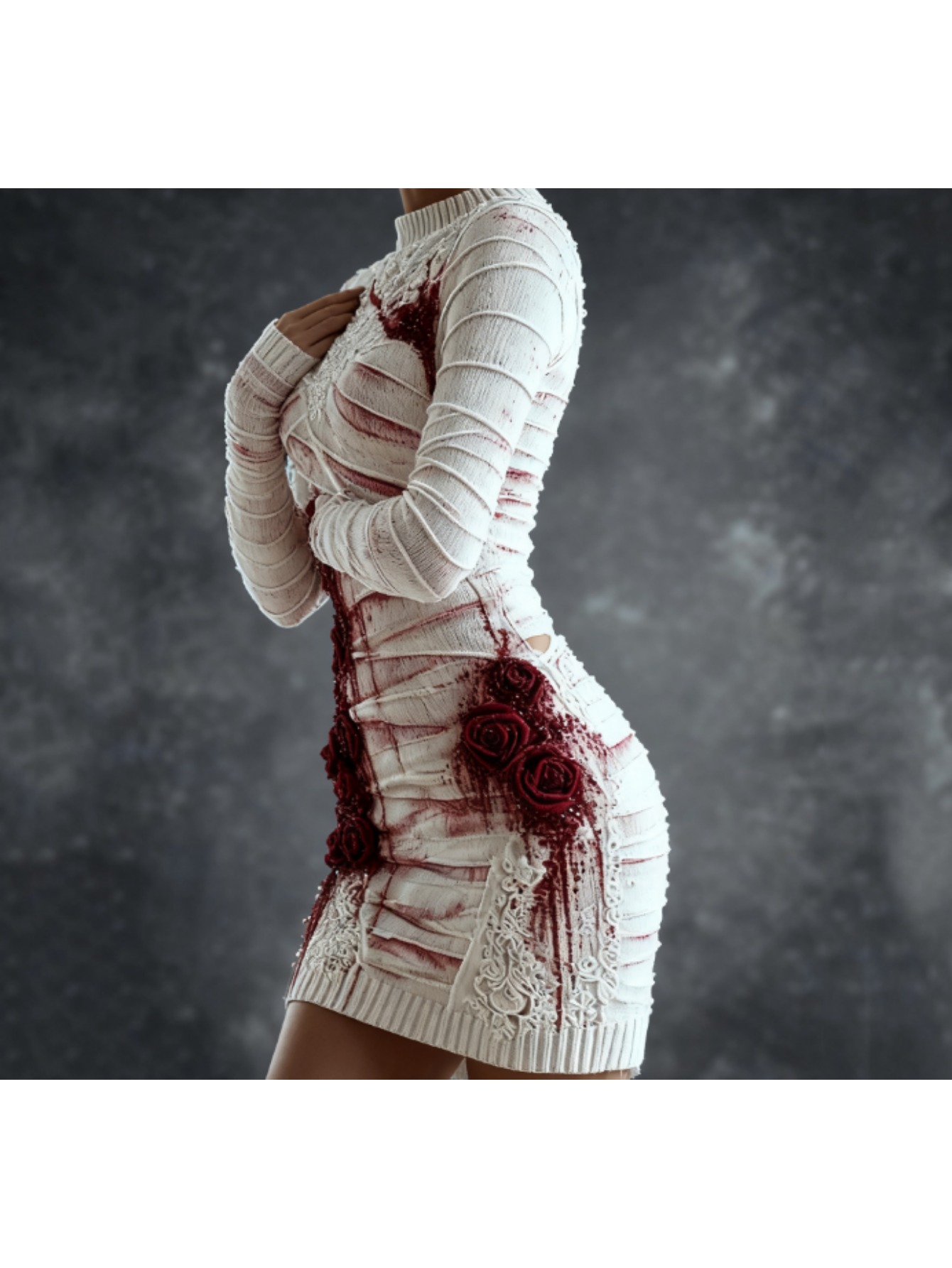 Women's Gothic Skeleton Print Sweater Dress - Form-Fitting Short Sleeve A-Line Dress with Round Neck, Hand Washable Costume Party Outfit for Halloween, Themed Events & Casual Wear (Skeleton Pattern)